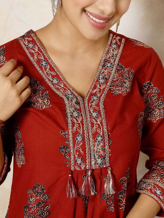 Dhiyona SN Women's Floral Embroidered V-Neck Mirror Work A-Line Kurta With Palazzo