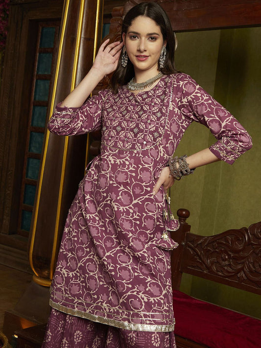 Dhiyona SN Women's Floral Printed Pleated Mirror Work Pure Cotton Kurta with Sharara & Dupatta