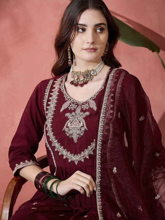 Dhiyona SN Women's Floral Embroidered Pleated Sequinned A-Line Kurta With Trouser And Dupatta