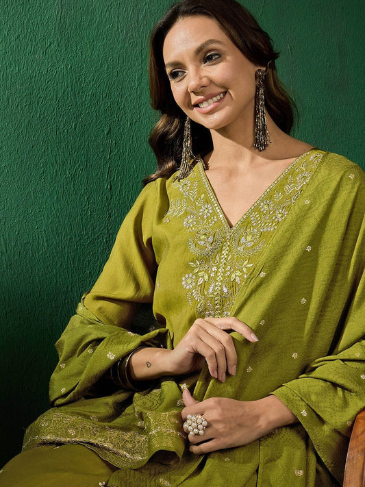 Dhiyona SN Women's Parrot Green Floral Sequinned Round Neck Straight Kurta With Palazzos And Dupatta