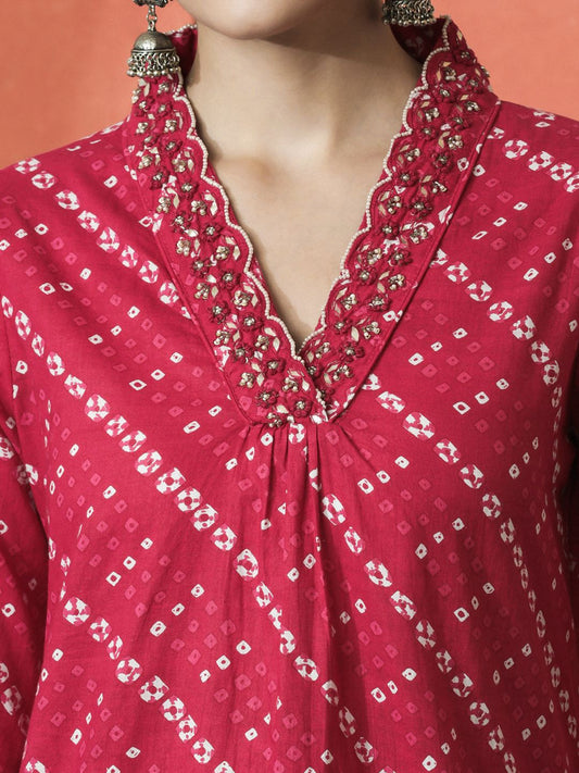 Dhiyona SN Women's Bandhani Printed V-Neck Pleated Pure Cotton Straight Kurta With Trouser & Dupatta