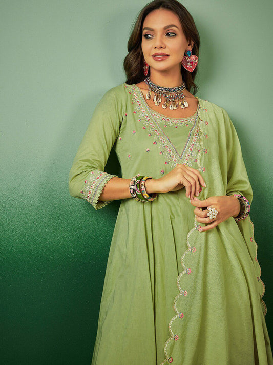 Dhiyona SN Women's Sequence Embroidered Pure Cotton Anarkali Kurta With Trousers & Dupatta