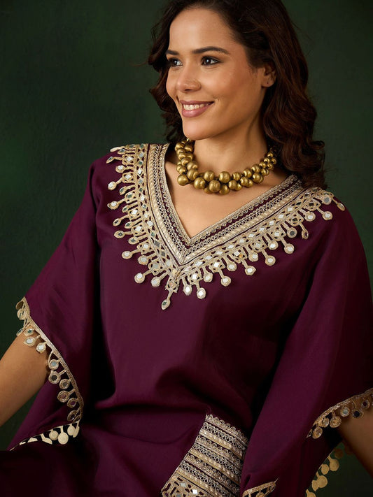 Dhiyona SN Women's Burgundy Geometric Embroidered V-Neck Mirror Work Kaftan With Trousers
