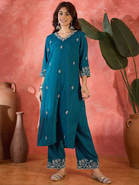 Dhiyona SN Women's Floral Embroidered Thread Work Straight Kurta With Trousers & Dupatta