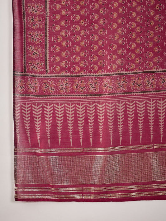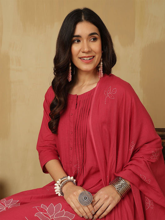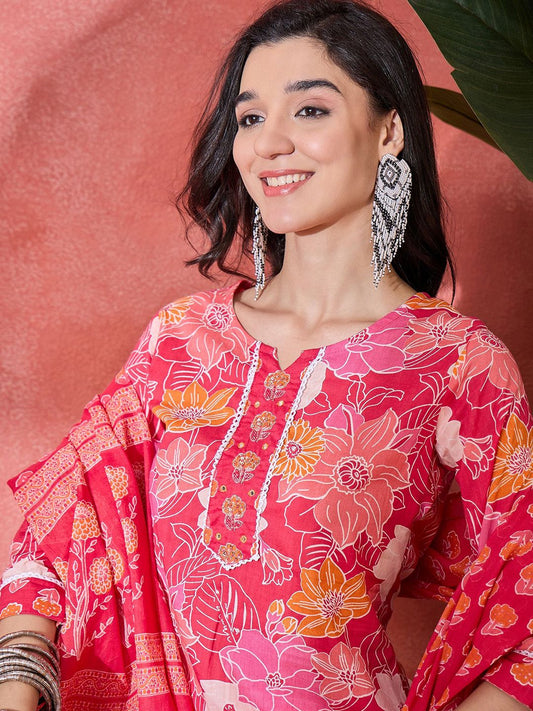 Dhiyona SN Women's Pink Floral Printed Pure Cotton A-Line Kurta With Trouser And Dupatta