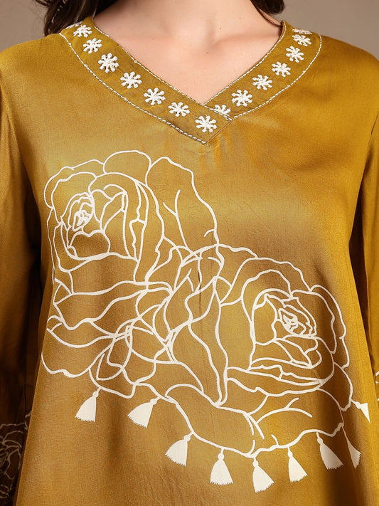 Dhiyona SN Women's Mustard Floral Embroidered V-Neck Kurta With Pant And Dupatta