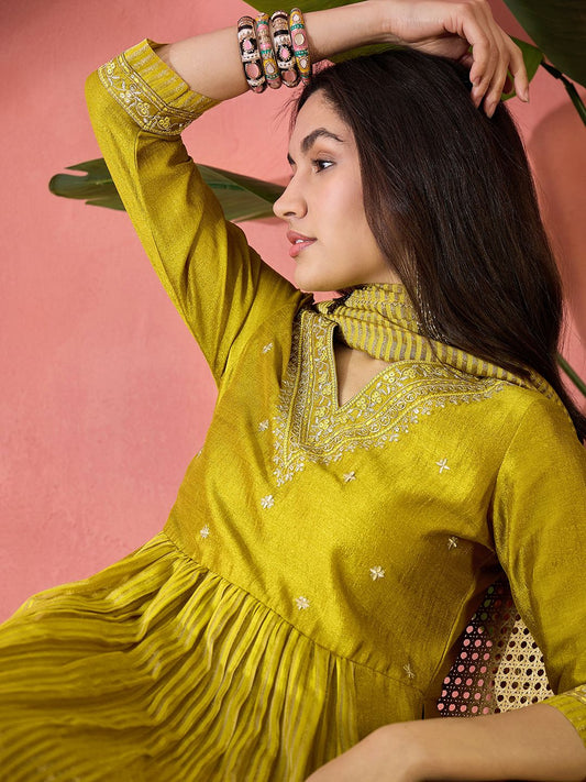 Dhiyona SN Women's Floral Yoke Design V-Neck Pleated Sequinned A-Line Kurta With Trousers & Dupatta