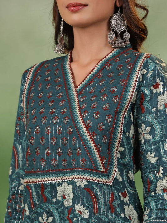Buy 2 Get 1 FreeVendor:Dhiyona SNDhiyona SN Women's Green Floral Printed V-Neck Gotta Patti Pure Cotton Kurta With Trousers & Dupatta