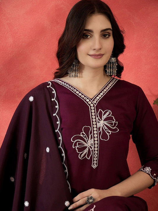 Dhiyona SN Women's Floral Embroidered Thread Work V-Neck Straight Kurta With Trouser And Dupatta
