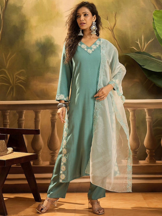Dhiyona SN Women's Teal Blue Paisley Embroidered Thread Work Straight Kurta & Trouser With Dupatta