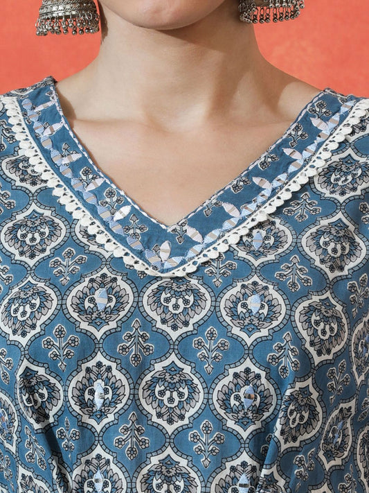 Dhiyona SN Women's Floral Print Empire Lace Insert Detail Pure Cotton A-Line Kurta with Trousers