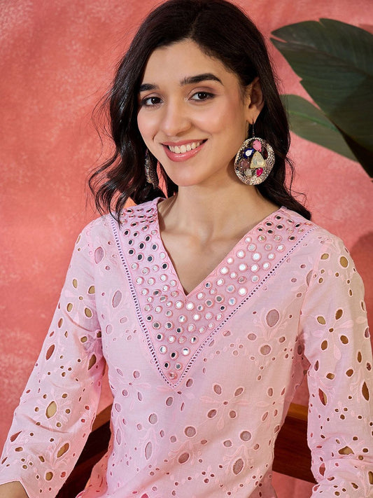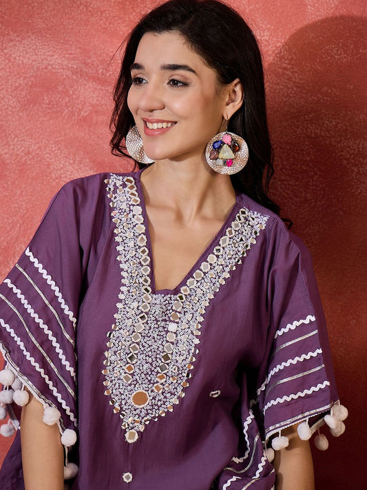 Dhiyona SN Women's Floral Embroidered Square Neck Mirror Work Kaftan Kurta With Trousers
