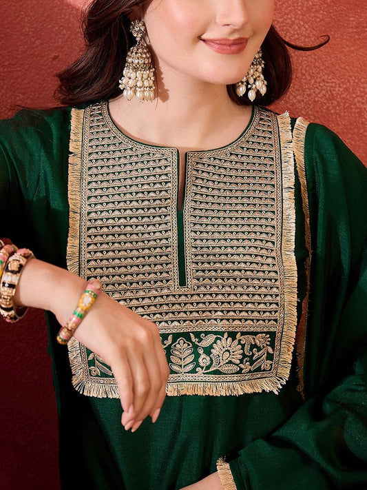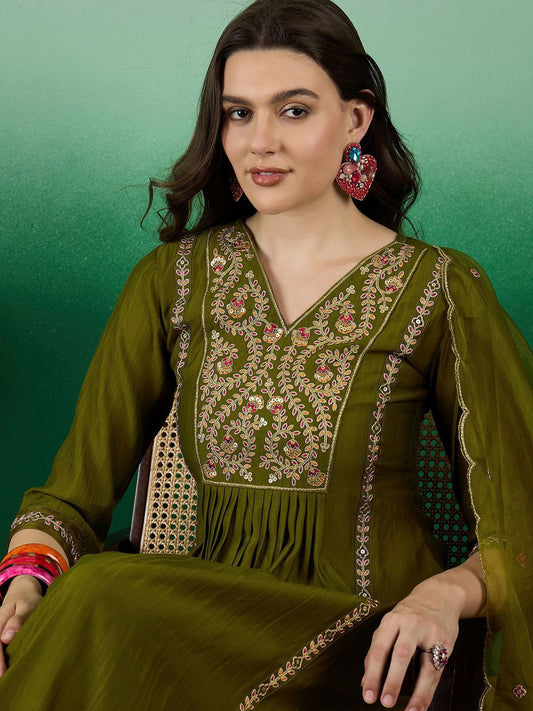 Dhiyona SN Women's Green Yoke Design Thread Work Pleated A-line Kurta With Trouser & Dupatta