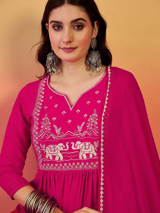 Dhiyona SN Women's Embroidered Notch Neck A-Line Kurta With Trousers & Dupatta