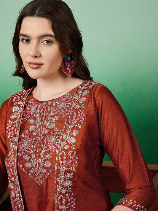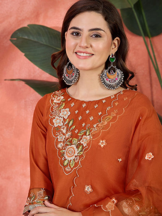 Dhiyona SN Women's Floral Embroidered Thread Work Pure Silk Straight Kurta & Trousers With Dupatta
