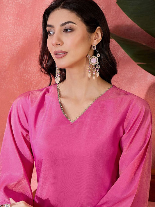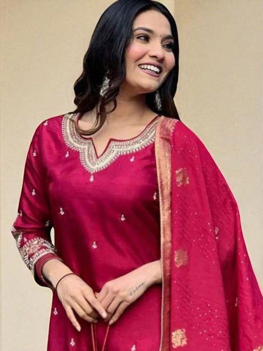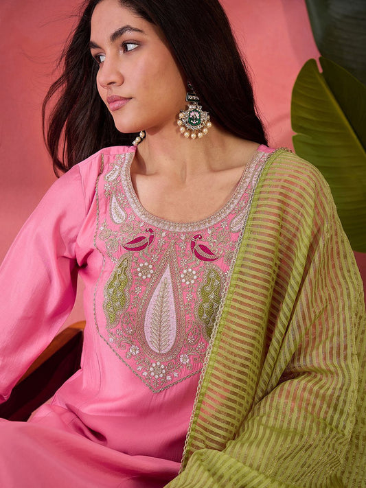 Dhiyona SN Women's Pink Silk Blend Straight Zari Sequence Embroidered Kurta Pant with Dupatta