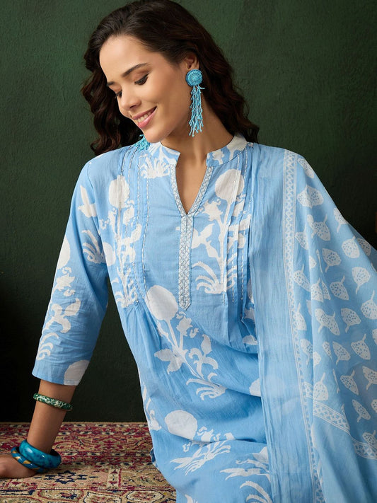 Dhiyona SN Women's Blue Floral Printed Mandarin Collar Pure Cotton Kurta With Trouser & Dupatta