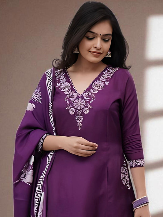 Dhiyona SN Women's Floral Embroidered Thread Work V-Neck Straight Kurta With Trouser And Dupatta