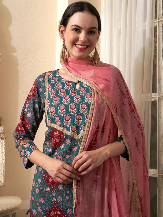 Dhiyona SN Women's Floral Printed Pure Cotton Straight Kurta With Trousers & Dupatta