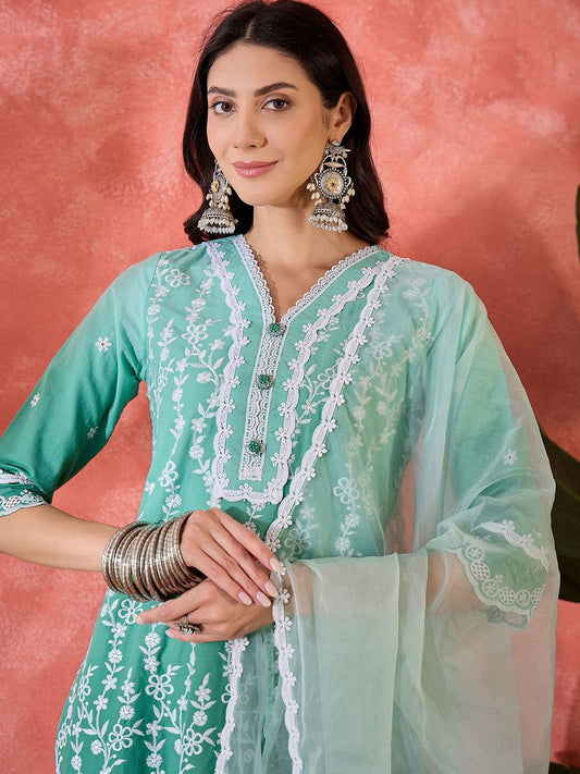Dhiyona SN Women's Green Floral Embroidered V-Neck Kurta With Trousers