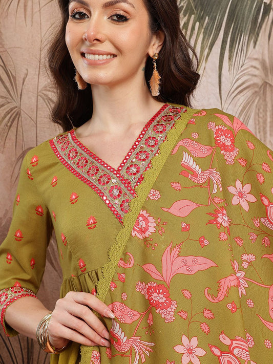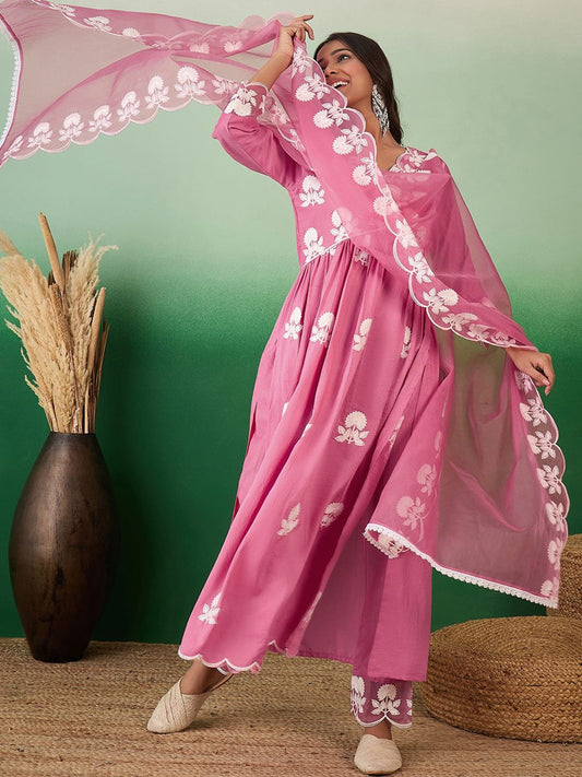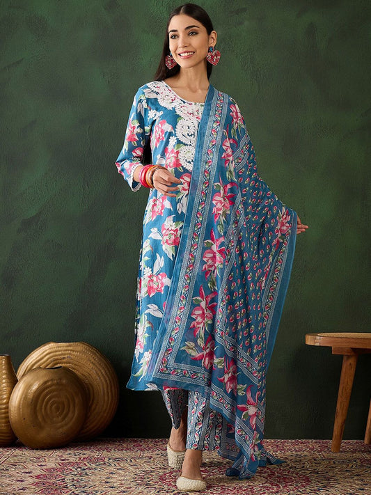 Dhiyona SN Women's Floral Print Thread Work Detail Empire Style A-Line Kurta with Trousers & Dupatta