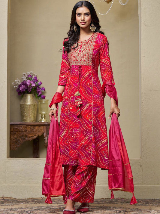 Dhiyona SN Women's Bandhani Printed Sequinned Kurta with Palazzo & Dupatta
