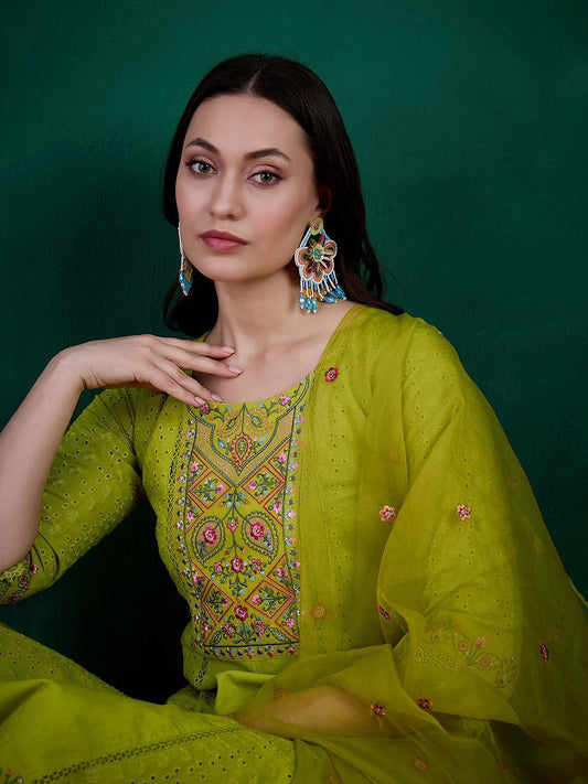 Dhiyona SN Women's Lime Green Floral Embroidered Straight Kurta With Trouser & Dupatta