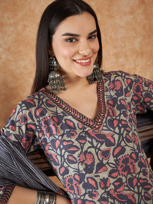 Dhiyona SN Women's Floral Printed V-Neck Pure Cotton Straight Kurta With Trousers And Dupatta