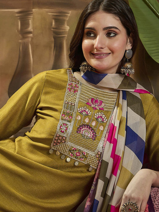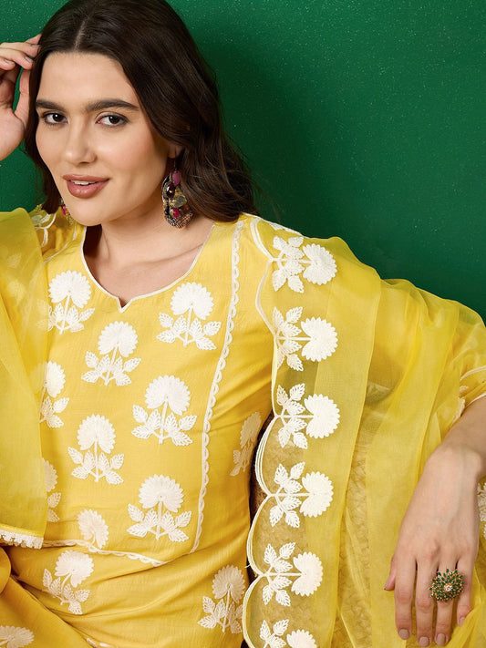 Dhiyona SN Women's Yellow Floral Embroidered Regular Sequinned Kurta With Trouser With Dupatta
