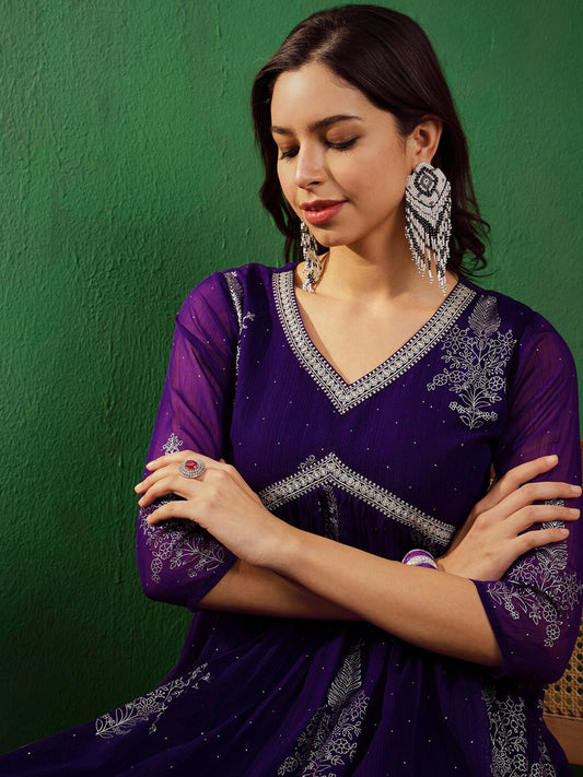 Buy 2 Get 1 FreeVendor:Dhiyona SNDhiyona SN Women's Floral Yoke Design Sequinned Chinon Silk Anarkali Kurta With Trousers And Dupatta