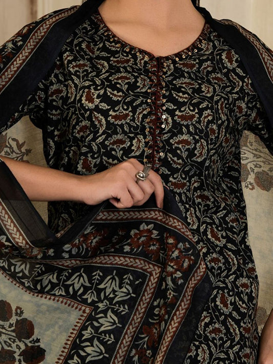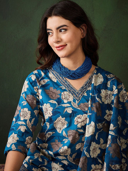 Dhiyona SN Women's Floral Printed Sequinned V-Neck Pure Cotton Straight Kurta & Trouser With Dupatta