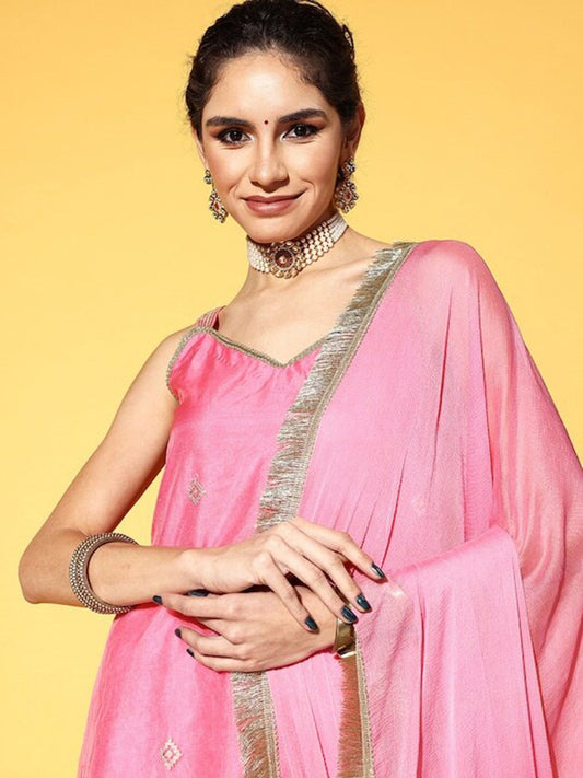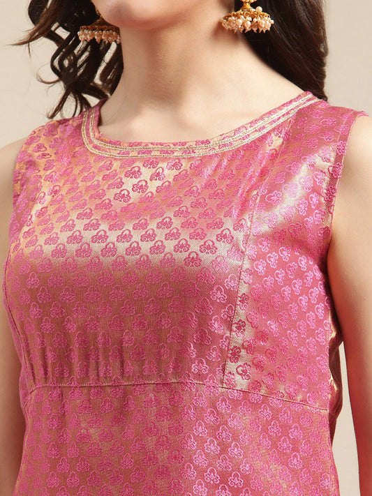 Dhiyona VA Women'sPink & Gold-Colored Brocade Sleeveless Kurta Sharara With Sequins Ruffle Dupatta