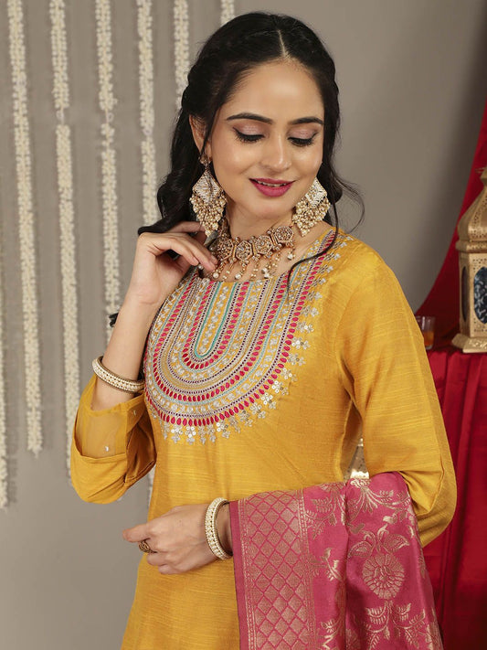 Dhiyona VA Women'sMustard Yellow Ethnic Motifs Embroidered Kurta with Palazzos & With Dupatta