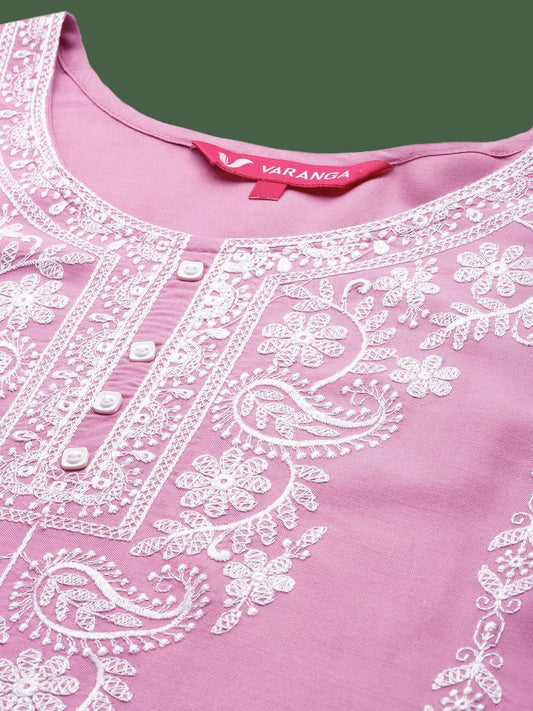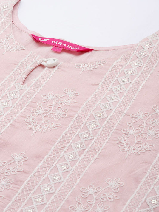 Dhiyona VA Women's Peach-Coloured Floral Embroidered Chikankari Chanderi Cotton Kurta Set