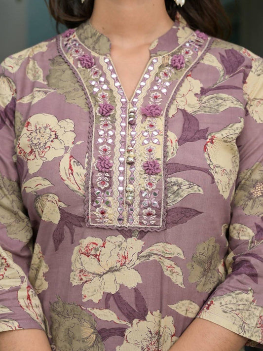 Dhiyona VA Women'sFloral Printed High Slit Kurta with Trousers