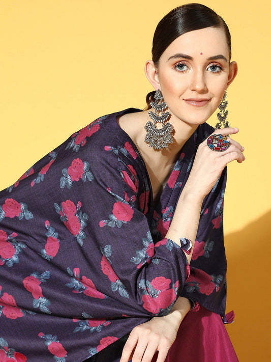 Buy 2 Get 1 FreeVendor:Dhiyona VADhiyona VA Women's Navy Blue Floral Printed Pleated Kurta with Palazzos