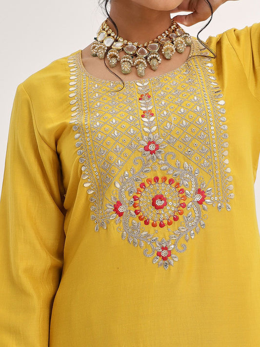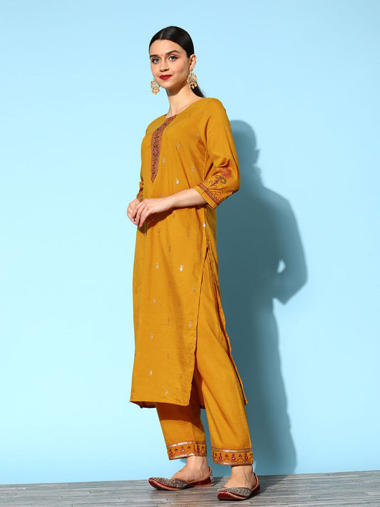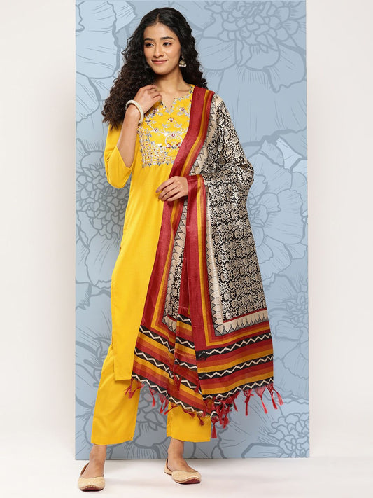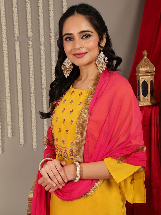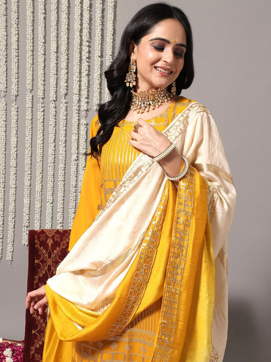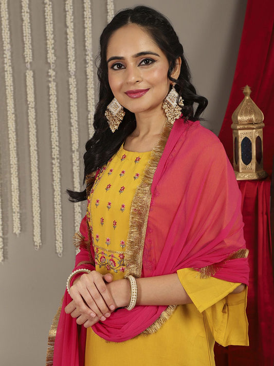 Dhiyona VA Women'sYellow Yoke Design Ethnic Motifs Straight Kurta & Trousers With Dupatta