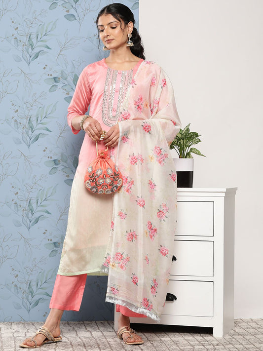 Dhiyona VA Women's Pink Ombre Embroidered Sequinned Kurta with Trousers & With Dupatta