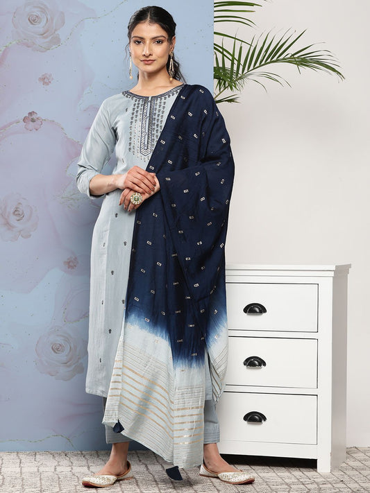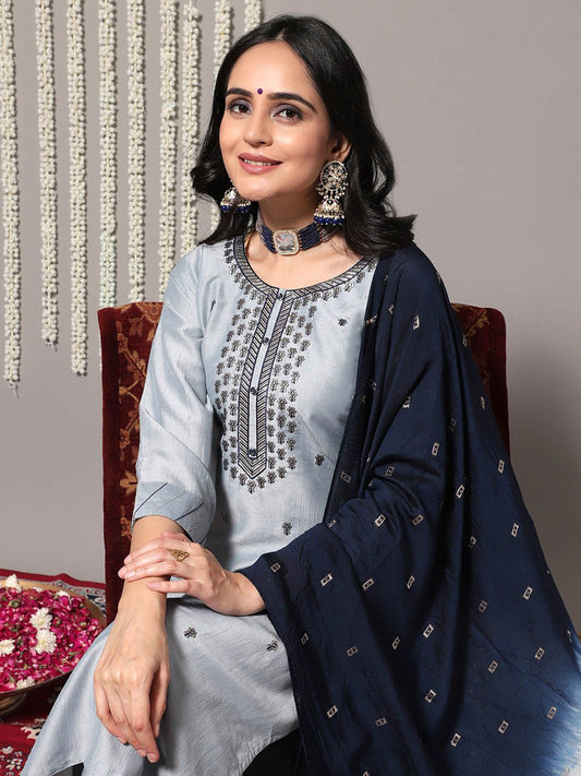 Dhiyona VA Women'sEthnic Motifs Embroidered Pure Cotton Empire Straight Kurta & Trouser With Dupatta
