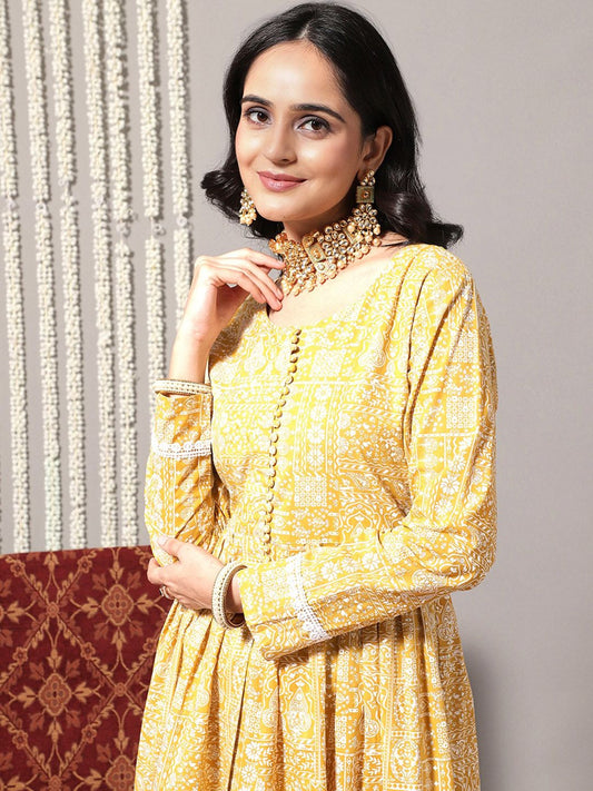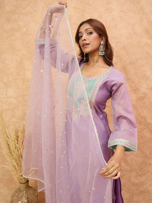 Dhiyona VA Women'sFloral Yoke Design Sequinned Panelled Anarkali Kurta With Palazzo & Dupatta