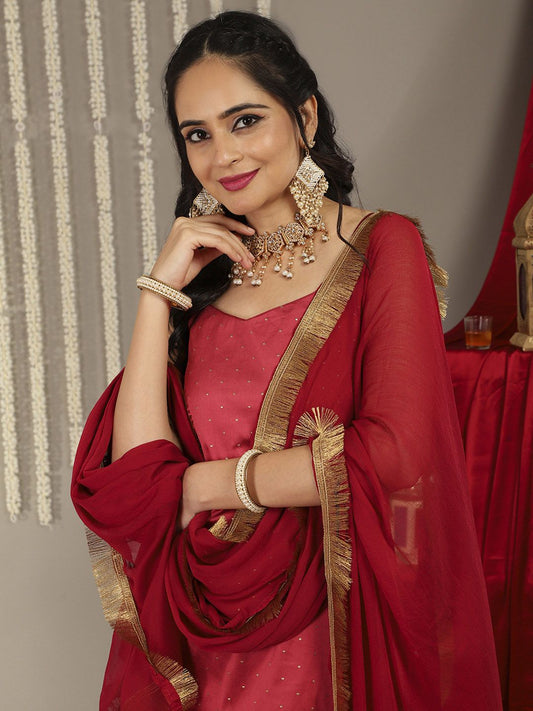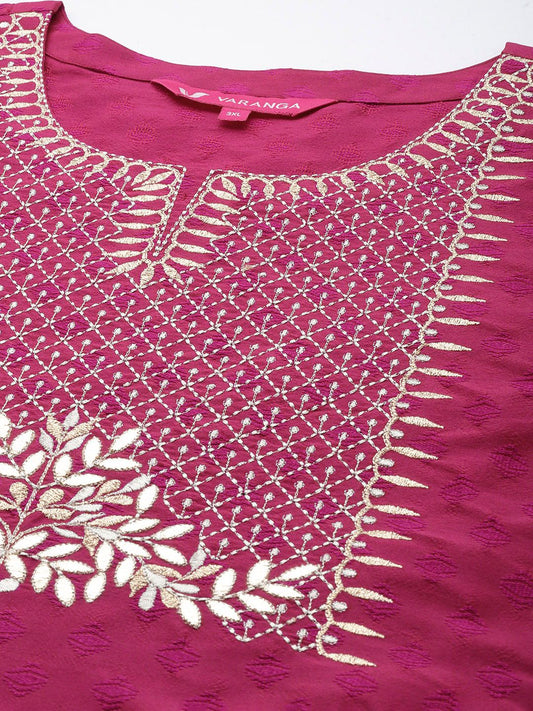 Dhiyona VA Women's Magenta & Gold-Toned Embroidered Kurta with Trousers & Dupatta
