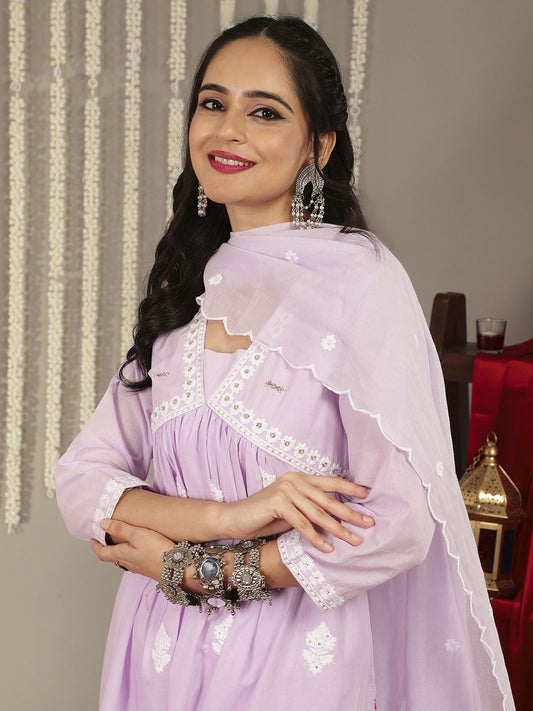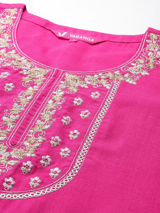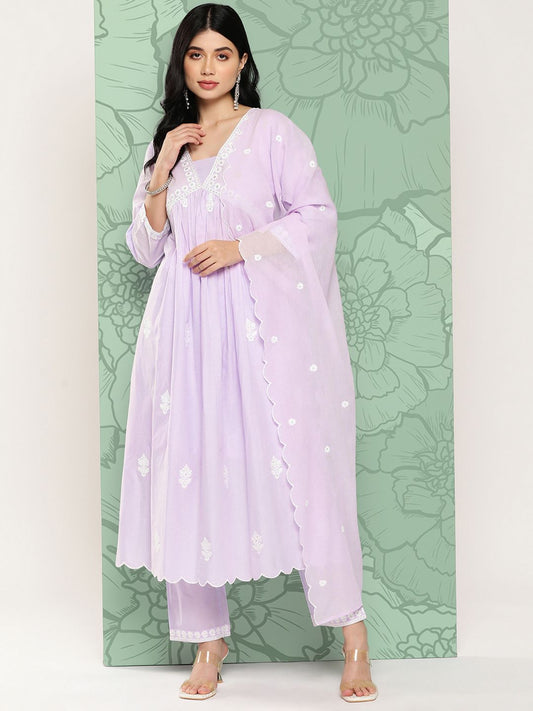 Dhiyona VA Women'sFloral Embroidered Empire Thread Work Pure Cotton Kurta With Trousers & Dupatta