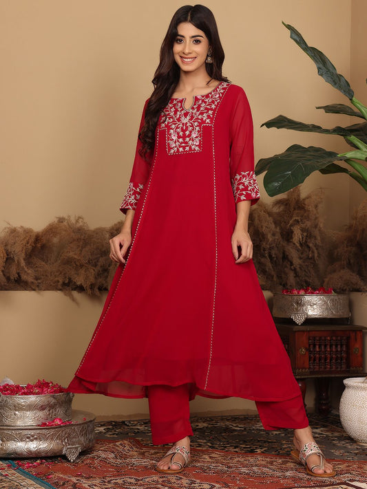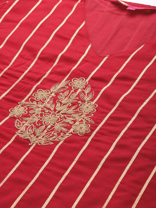 Dhiyona VA Women's Red Floral Embroidered Kurta with Trousers & With Dupatta