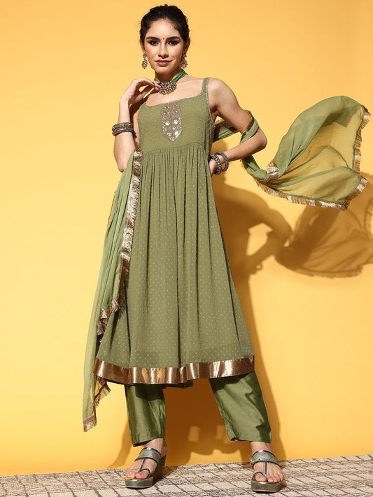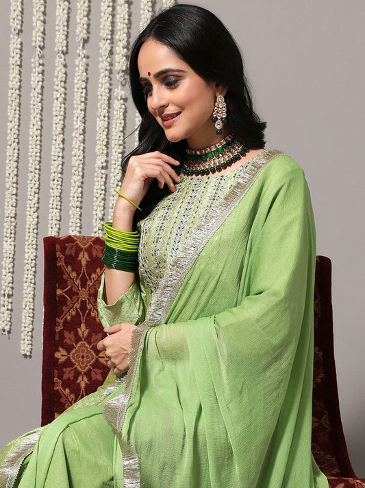 Dhiyona VA Women's Green Ethnic Motifs Gotta Patti Kurta with Trousers & With Dupatta