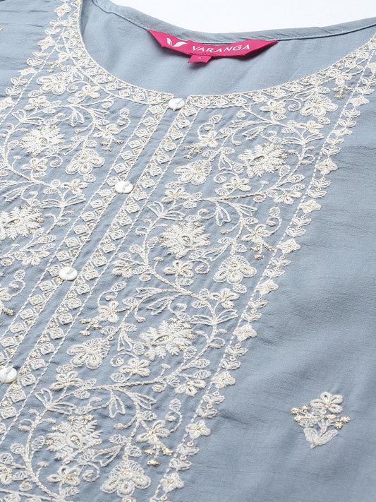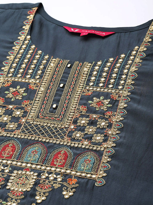Dhiyona VA Women's Grey Ethnic Motifs Embroidered Panelled Kurta with Trousers & Dupatta