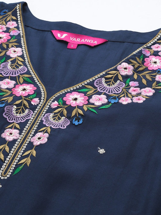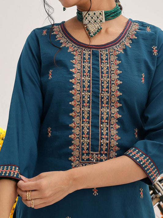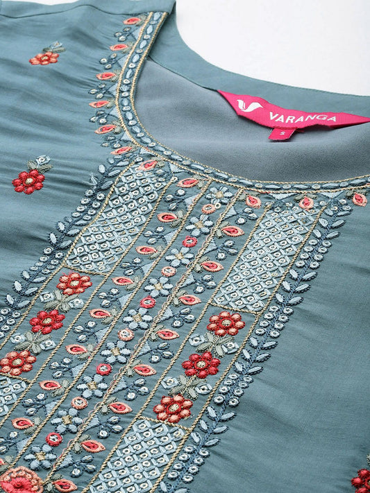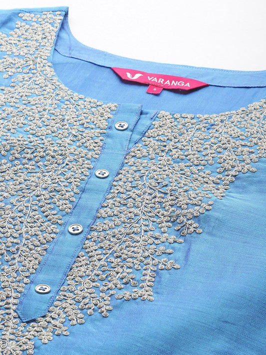 Dhiyona VA Women's Blue Ethnic Motifs Yoke Design Thread Work Kurta with Sharara & With Dupatta