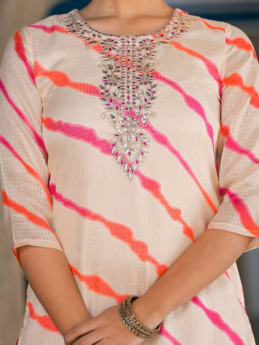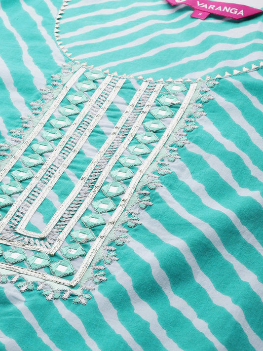Dhiyona VA Women's Leheriya Striped Regular Gotta Patti Cotton Kurta with Trousers & Dupatta