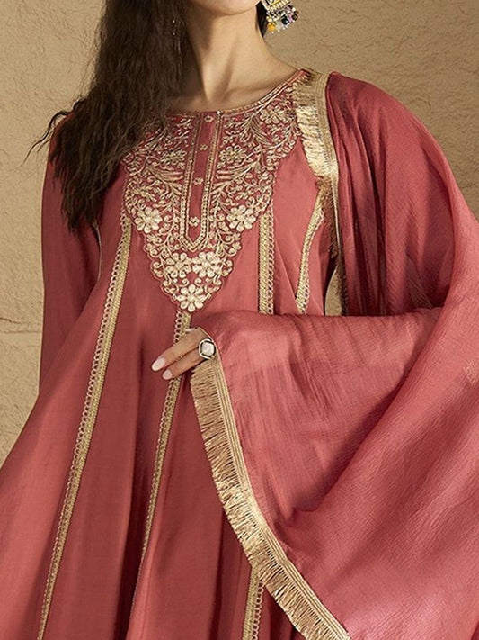 Dhiyona VA Women'sPink Gotta Patti Floral Embroidered V- Neck Empire Kurta With Trousers & Dupatta