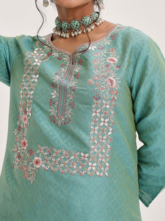 Dhiyona VA Women'sFloral Yoke Design Gotta Patti Kurta & Trousers With Dupatta