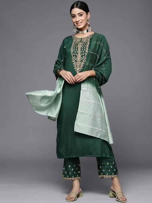 Dhiyona VA Women'sEmbroidered Sequinned Straight Kurta & Trousers With Dupatta